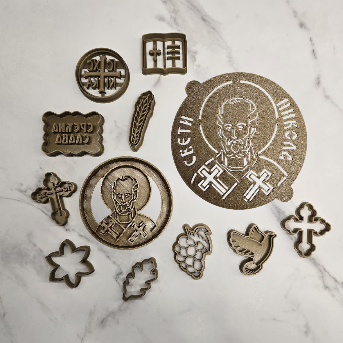 Ovaj set za slavu sastoji se od modli za slavski kolač i šablona za žito sa motivom Svetog Nikole. Svi proizvodi izrađeni su preciznom 3D štampom kako bi se dobio čist, jasan i ujednačen otisak.